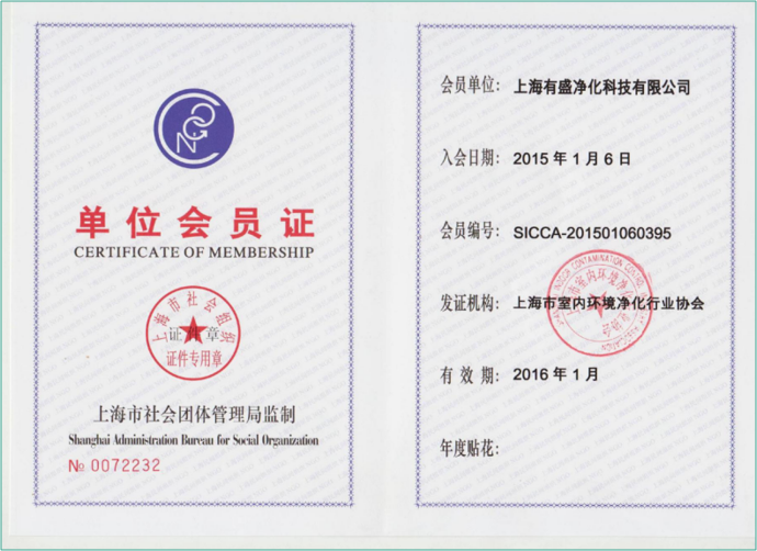 上海有盛凈化室內(nèi)環(huán)境凈化行業(yè)協(xié)會(huì)會(huì)員證書(shū)